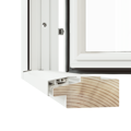 Harmoni inåtgående fönsterdörr erbjuds med två tröskelalternativ, här visas den lägsta varianten. Tröskel i trä med utvändig del av aluminium, höjd 48 mm.