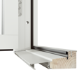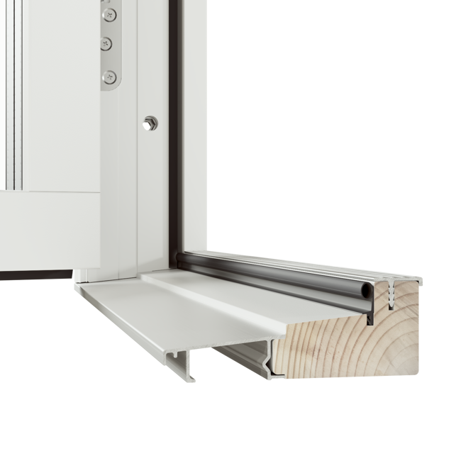 Original Trä Altan- och Fönsterdörr erbjuds med tre tröskelalternativ, här visas den högsta varianten. Tröskel i trä med utvändig del av aluminium, höjd 42 mm.