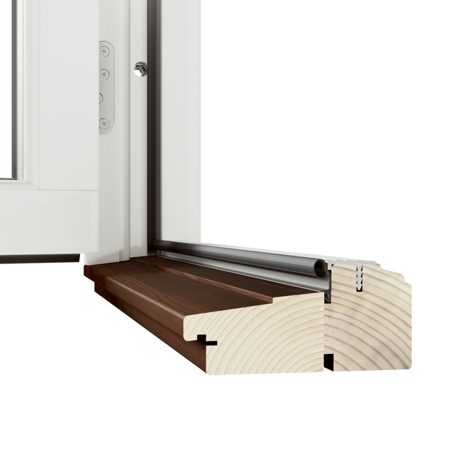 Retro Altan- och Fönsterdörr erbjuds med tröskelalternativet som visas på bilden, en tröskel i trä med höjd 48 mm.